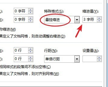 2、打开段落设置窗口,在缩进区域下的“悬挂缩进”,缩进值改成“1”或自己想要的大小。