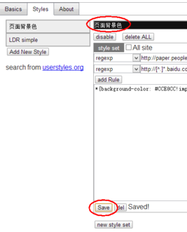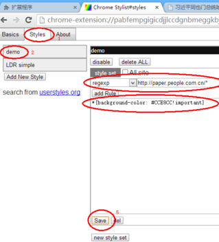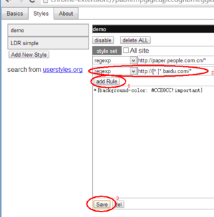 选择Styles-demo,选择regexp,表示表达式,在后面写入自己要修改背景色的站点,注意最后的*号,表示这个站点所有页面都修改背景色,这也是正则表达式的功能。