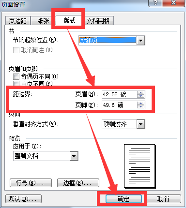 在”页面设置“界面上,点击”版式“,然后在”距边界“里找到”页脚“设置栏,根据个人的需要,适当调整上面的数值,最后点击”确定“即可。