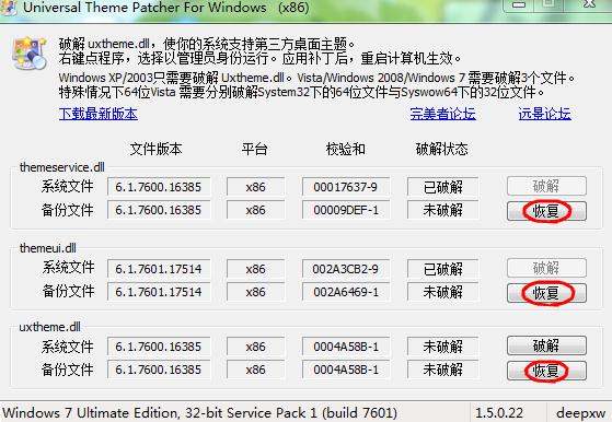 2、如果没有中文名字,还出这样的错误,这需查看C:\windows\system32目录下,有这三个文件themeservice.dll.backup、themeui.backup、uxtheme.dll.backup这三个文件是UniversalThemePatcher破解主题的时候对原系统文件的备份!因此如果你的电脑里面有的话就不用去下载了,然后,下载一个UniversalThemePatcher-x64.exe(64位系统)或者UniversalThemePatcher-x86.exe(32位系统),然后运行它,依次点击恢复三个文件即可,这时候在运行虚拟电脑就不会报错了。