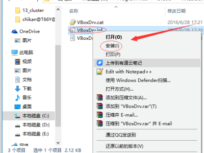 5、在打开的文件夹中右键VBoxDrv.inf文件,点击安装,就可以解决出现的问题了。