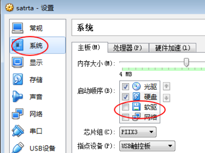 1、可尝试点击上方“设置”,点击“系统”,取消勾选“软驱”。