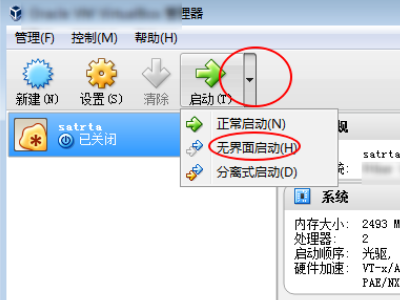 6、返回虚拟机主页,点击启动选项旁边有个黑色的小箭头,第一次安装系统的话点击里面选择无界面启动。