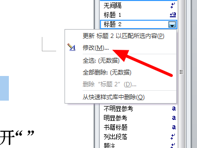 2、然后我们在弹出来的窗口中点击打开“标题2”后面的倒三角形,选择“修改”。