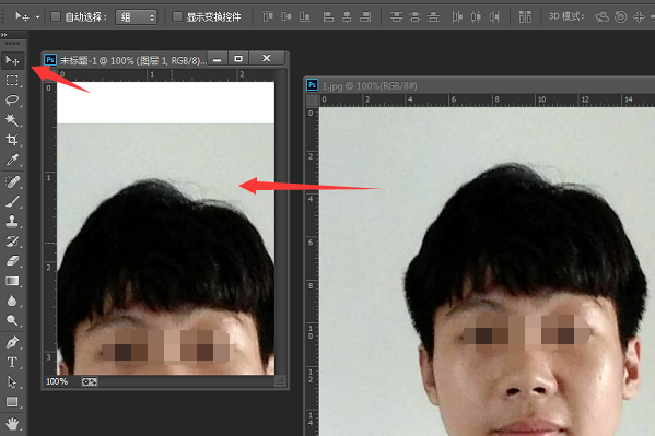 6、在打开的图片中点击第一个箭头工具,按住图片将其拖移到新建的画布。