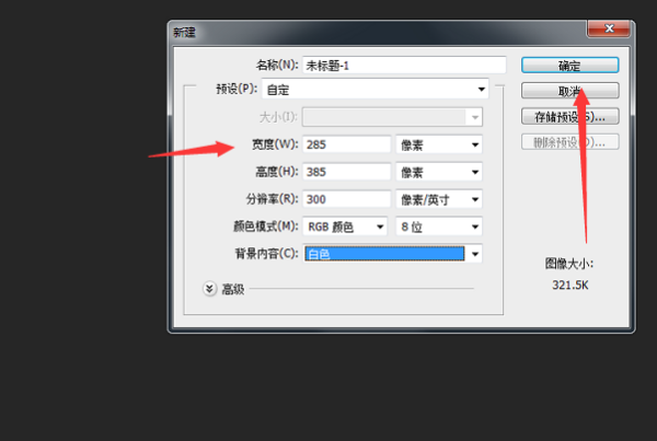 3、在出现的新建的对话框中输入宽度、高度像素分别是285和385,点击确定按钮。