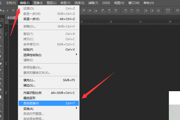 7、将图片拖移到画布以后点击编辑,选择自由变换。