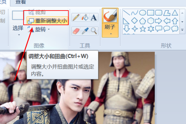 2、这样就可以快速地进入到画图软件界面,选择菜单栏上面的重新调整大小。