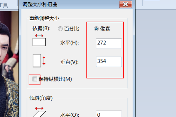 3、在设置调整大小的界面,选择像素,再将保持纵横比前面框里面的勾去掉。输入需要修改的数值。