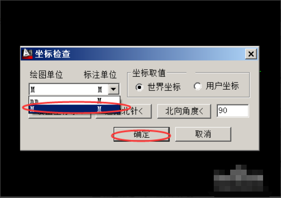 5、在坐标检查中选择绘图单位和标注单位中选择M选项,然后点击确定。
