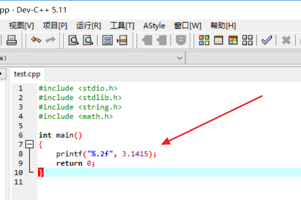 2、在test.cpp文件中,输入C语言代码:printf("%.2f", 3.1415);。