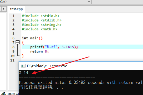 3、编译器运行test.cpp文件,此时成功将浮点数保留了小数点后面2位进行了输出。