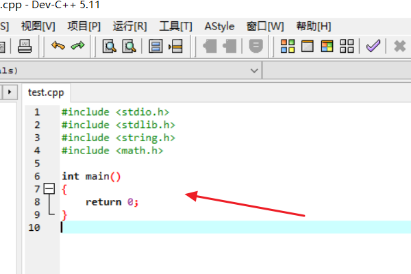 1、首先,打开C语言编译器,新建一个初始.cpp文件,例如:test.cpp。