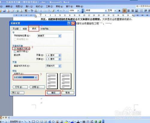 在页面设置中点版式,勾选奇偶页不同,应用于“整篇文档”,最后确定