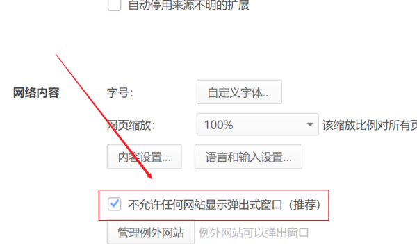3、在高级设置中,勾选不允许任何网站显示弹出式窗口,即可解决问题。