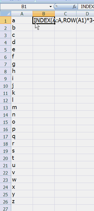 =INDIRECT("A"&ROW(A1)*3-2)&INDIRECT("A"&ROW(A1)*3-1)&INDIRECT("A"&ROW(A1)*3)