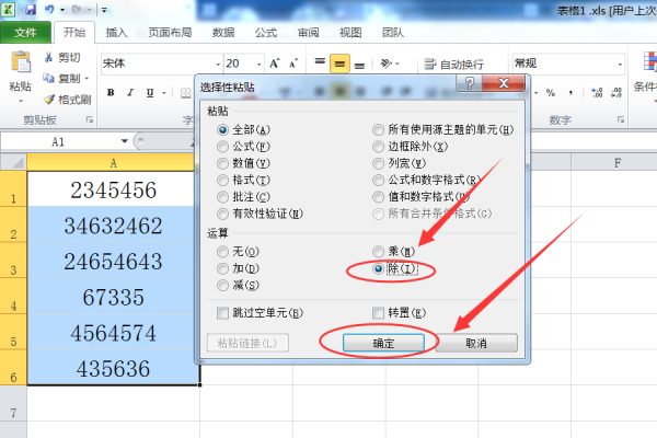 3、在选择性粘贴设置界面,找到运算,选中“除”,然后点击下面的确定按钮即可。