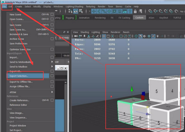 1、首先打开Maya软件,用Maya打开模型场景,选中需要的模型,然后点击file,在选择export selection选项导出: