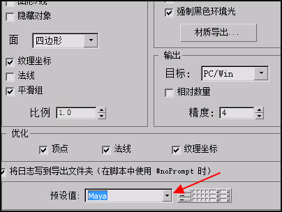 3.这样,将弹出0bj设置对话框,打开预置选项栏,选择“Maya”,点击导出,如下图所示。