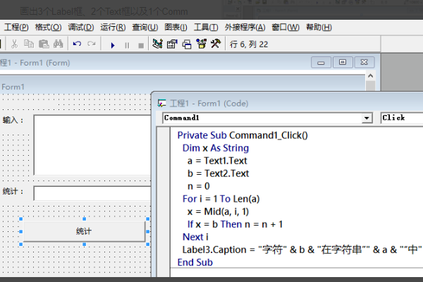 PrivateSubCommand1_Click()DimxAsStringa=Text1.Textb=Text2.Textn=0Fori=1ToLen(a)x=Mid(a,i,1)