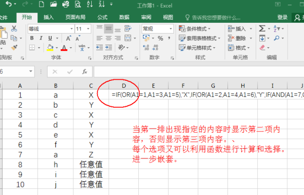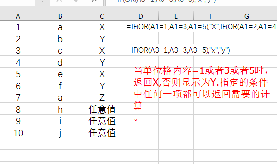 =IF(OR(A1=1,A1=3,A1=5),"X",IF(OR(A1=2,A1=4,A1=6),"Y",IF(AND(A1=7,OR(B1="a",B1="b",B1="c")),"Z","任意值")))
