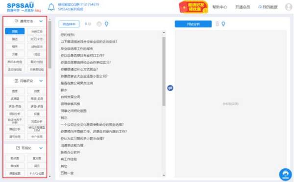 SPSSAU是一款专业的在线智能统计分析工具,提供了非常全面的数据分析方法。适合科研人员、市场调研人员、统计小白、论文分析困难户使用。