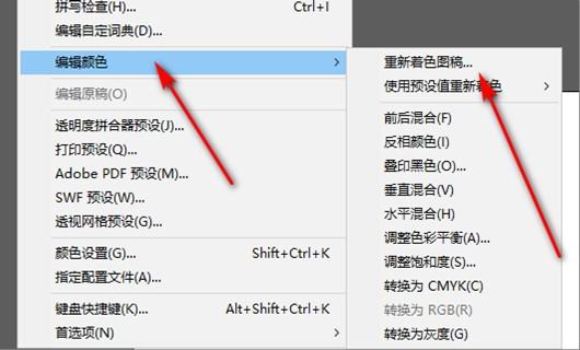 3、接着,完成上述步骤后,单击“编辑颜色”选项,然后选择“重新着色图稿”选项,如下图所示,然后进入下一步。