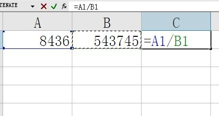 2.在C1内输入=号,然后选A1格,再打个/号(表示除以的运算),再选B1单元格,最后按 ENTER 完成。