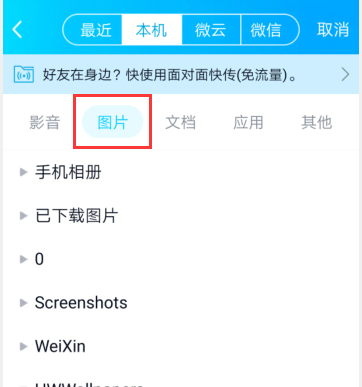 使用微信、QQ、网盘、电子邮件等方法都可以把一个手机内的照片、文件传至另一手机,这里演示一下使用QQ发送照片的操作方法: