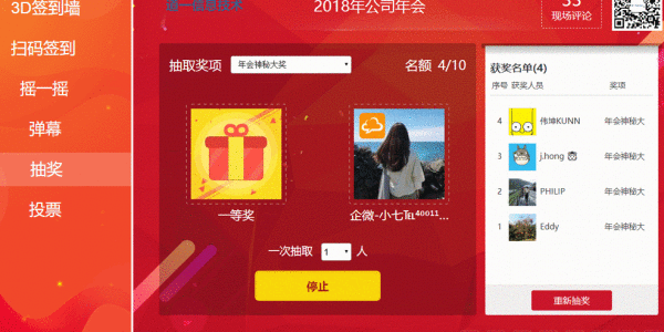 作为历来年会的压轴抽奖环节,很多公司都会选择微媒网络-大屏互动团队开发的“3D酷炫抽奖”形式。大屏上3D效果滚动所有伙伴的头像,在全场高度关注下,寻觅现场锦鲤,送福利同时轻松吸引全场目光,现场氛围嗨翻天。