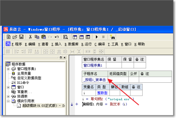 6、双击按钮1,在子程序“_按钮1_被单击”下面新建一个名为“i”的整数型变量,然后编写代码如下:i = 取句柄2 (“notepad.exe”)编辑框1.内容 = 到文本 (i)。