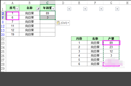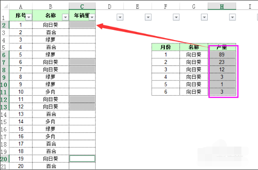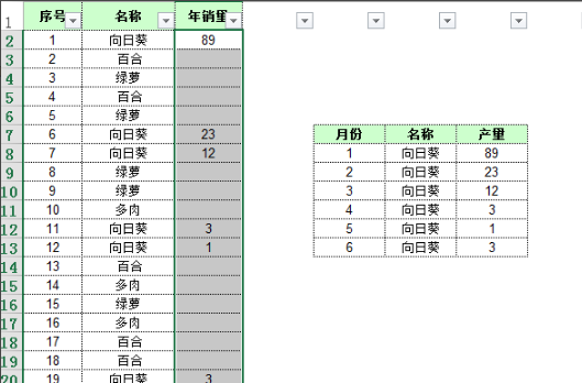 5、现在我们来按名称全选查看效果,发现相应的向日葵的销量已经按顺序填充。