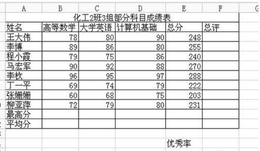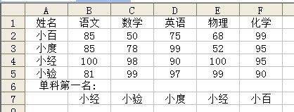下图是一个电子表格范例,我们要求全班同学在每个科目中的最高分