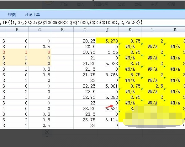 6、在M2单元格输入公式=IFERROR(VLOOKUP($K2&$L2,IF({1,0},$A$2:$A$1000&$B$2:$B$1000,C$2:C$1000),2,FALSE),0),同时按住ctrl+shift+enter,将公式转换为数组,思路为屏蔽错误值,而后右拉,下拉,我们看到所有错误值都不显示了