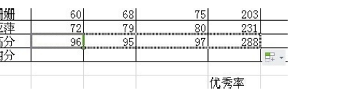 我们要继续求出英语,计算机,和总分的最高分,则只需选中高等数学的最高分,然后鼠标指向单元格的右下角,当鼠标光标呈现实心的十字形状时,按住鼠标左键,往右拖动,拖到总分的最高分的那个单元格即可。