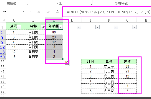 这里我们重点讲一下该公式的用法,=INDEX(目标区域,行号,列号),在这里目标区域需要锁定,行号是递增的等差序列1,2,3,4,5,6,产量的列号为3。实现行号的递增就需要使COUNTIF函数来统计满足条件的个数。即B$1:B2,B$1:B3……中B2的个数。