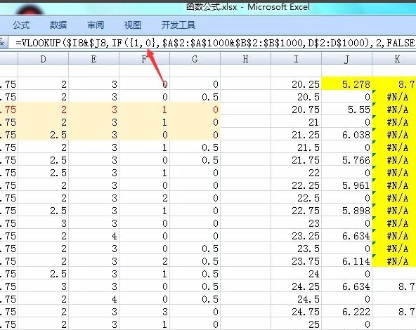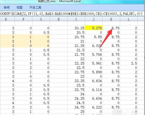 4、输入公式=VLOOKUP($K2&$L2,IF({1,0},$A$2:$A$1000&$B$2:$B$1000,C$2:C$1000),2,FALSE)