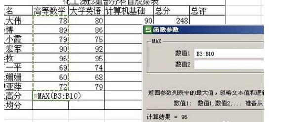点击确定,我们就求出了全班同学的高等数学最高分是96分