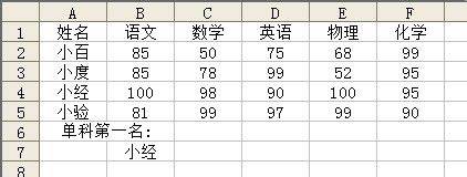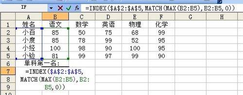 选择B7单元格,输入“=INDEX($A$2:$A$5,MATCH(MAX(B2:B5),B2:B5,0))”,按回车,显示该科目最高分对应的学生姓名。