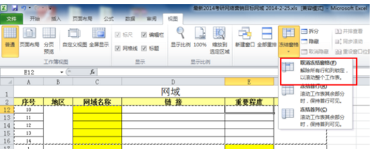 在点击冻结拆封窗口以前要先选择你所要固定的列或者行,以行为例,如图所示