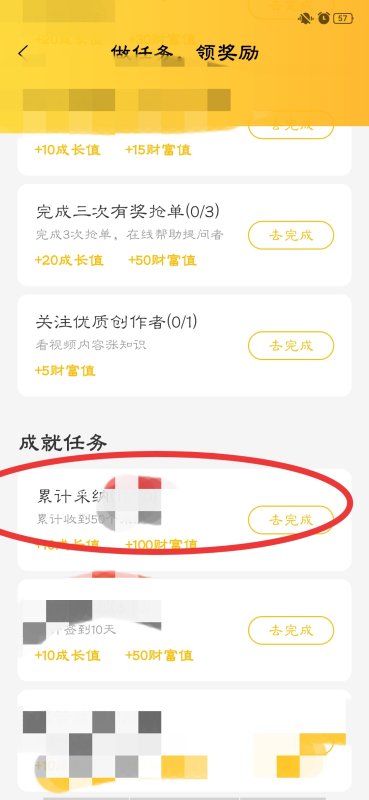 答题奖励页面上,下滑。“成就任务——累计采纳”