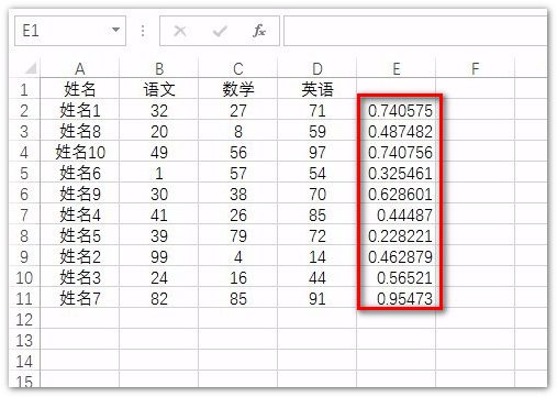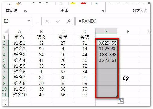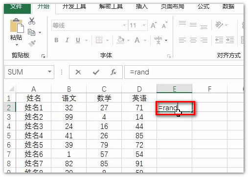 2、然后在E2单元个中输入“=”号,添加辅助函数rand。