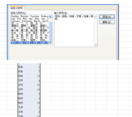 步骤四:在新窗口中依次输入系列“百科,经验,知道,文库,知道,贴吧”,然后点击右侧的“添加”,最后点击确定就可以了。