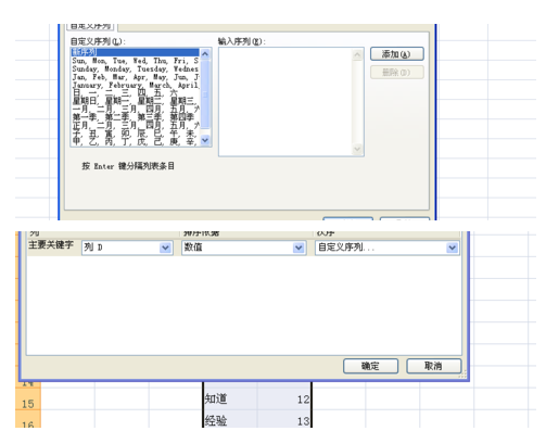 一、Excel自定义排序 设定自己需求的排序方法; 现在我有一张表,有“日期”和“地点”,我希望将“地点”按照我的方式如:北京、上海、天津、广州,这样来排序;(如下图)地点排序很乱,我们该如何来将它按照自己的方式来排序呢? 步骤一、打开菜单栏的“工具”-->选项,然后在弹出的“选项”窗口中选择“自定义序列”,在右边的“输入序列”中依次输入北京、上海、天津、广州,每输入一个地点时,就回车一次,输入完成后点击“添加”按钮 步骤二、回到Excel工作表,选中“地点”这一列; 步骤三、选中以后,单击“数据”-->排序-->选项,在“自定义排序次序”中找到刚才添加的“北京,上海,天津,广州”这excel如何随机排序?