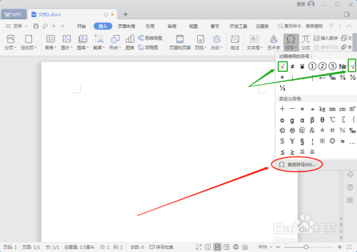 点击一下“其他符号”。(虽然示例图中“近期使用的符号”里有勾(√),但从没使用过的小伙伴可能没有,所以我们以“近期使用的符号列表”里没有为例来进行说明。)