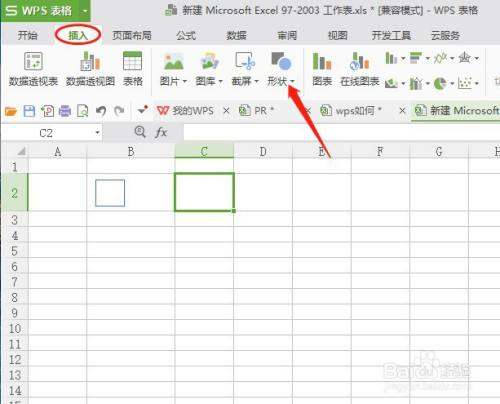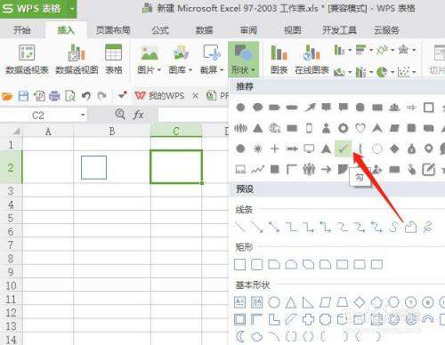 打开表格后,以在方框中打勾为例,单击插入菜单,在下面选择形状命令。