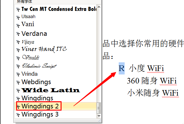 2、选中大写“R”字符,将其字体设置为“Wingdings 2”。