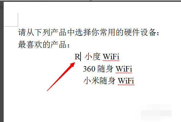 1、首先在需要插入方框内打勾符号的地方输入一个大写“R”字符。