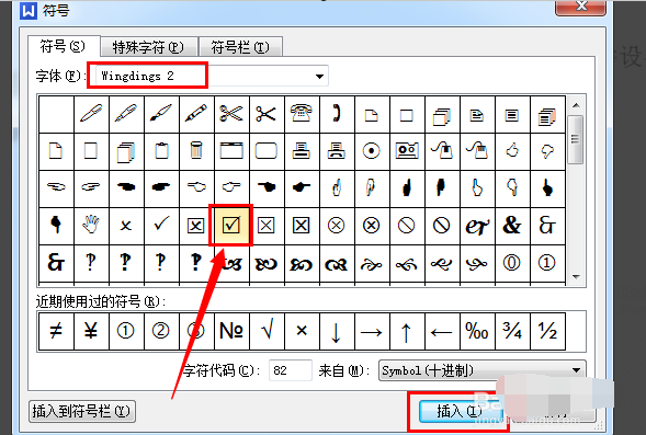 5、在打开的窗口中,选择“Wingdings 2”字体,然后找到方框内打勾符号,点击“插入”按钮即可。
