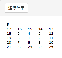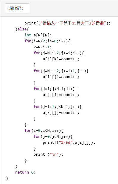 if(N<=2 || 15 printf("请输入小于等于15且大于2的奇数"); }else{ int a[N][N]; for(i=N/2;i>=0;i--){ k=N-i-1; for(j=N-i-2;j>=i;j--){ a[j][k]=count++; } for(j=N-i-2;j>=i+1;j--){ a[i][j]=count++; } for(j=i;j a[j][i]=count++; } for(j=i+1;j a[k][j]=count++; } } for(i=0;i for(j=0;j printf("%-5d",a[i][j]); } printf("\n"); } } return 0; } 相关文章 高手帮改一个通达信主图公式{DRAWGBK(O>0,RGB(33,47,58),RGB(0,0,0),0,'02',0);} {标缺口} LL:=REF(L,1);HH:=REF(H,1);上跳:=L>HH;下跳:=HREF(H,1),L,REF(H,1),3.1,-1),COL 易语言怎么获取某个程序编辑框的句柄.版本 2.程序集 窗口程序集1 .程序集变量 父, 整数型 .程序集变量 账号, 整数型.子程序 _按钮1_被单击父 = 窗口标题取句柄 (“2010”) 谁在核桃编程工作?加班多吗?感觉辛苦吗?我在核桃编程工作,工作辛不辛苦其实主要看心态。你如果认为一份工作做得很辛苦,就是自己不喜欢,只要热爱,就不会有辛苦的感觉。就目前我的状 怎么可以发布自己编程的游戏?steam:需要交100美元上架费用,就可以在steam上架1款游戏(每上架1款游戏都需要交钱)可以发布电脑游戏(桌面应用程序),手机游戏,虚拟现实(VR)游戏。疑似不支 ug自学好还是培训好培训好,有师傅教指导上手比较快,学的方法和东西比较多,时间相对比较短。自学需要大量时间和精力,还有个人毅力,如果个人毅力不够,往往学不下去,加上没有师傅指点 会不会英语会是成为学编程的障碍?英语不会成为学编程的障碍。 首先,编程语言虽然是用英文字母作为载体,但是这些代码没有英文的语法要求,也不涉及口语的表达,所以把编程语言看成 matlab如何编程首先,在我们的桌面上找到matlab软件的图标,将鼠标移到该位置双击点开,这时电脑屏幕会弹出matlab软件的主界面。其次,在这里我们不提倡在中间的那一栏直接写程序(对 980TDB数控车床加工梯形皮带轮怎样编程?O9513(V形槽形状车削循环)(2016-12-3)(广数与发那科#5003替换为#5002 ,倒角D替换为R)(粗车G65P9513 XZER U IJK F)(有E则为梯形槽)(X=